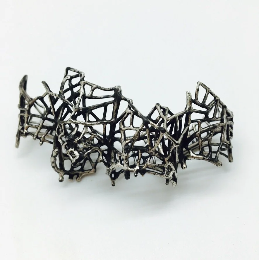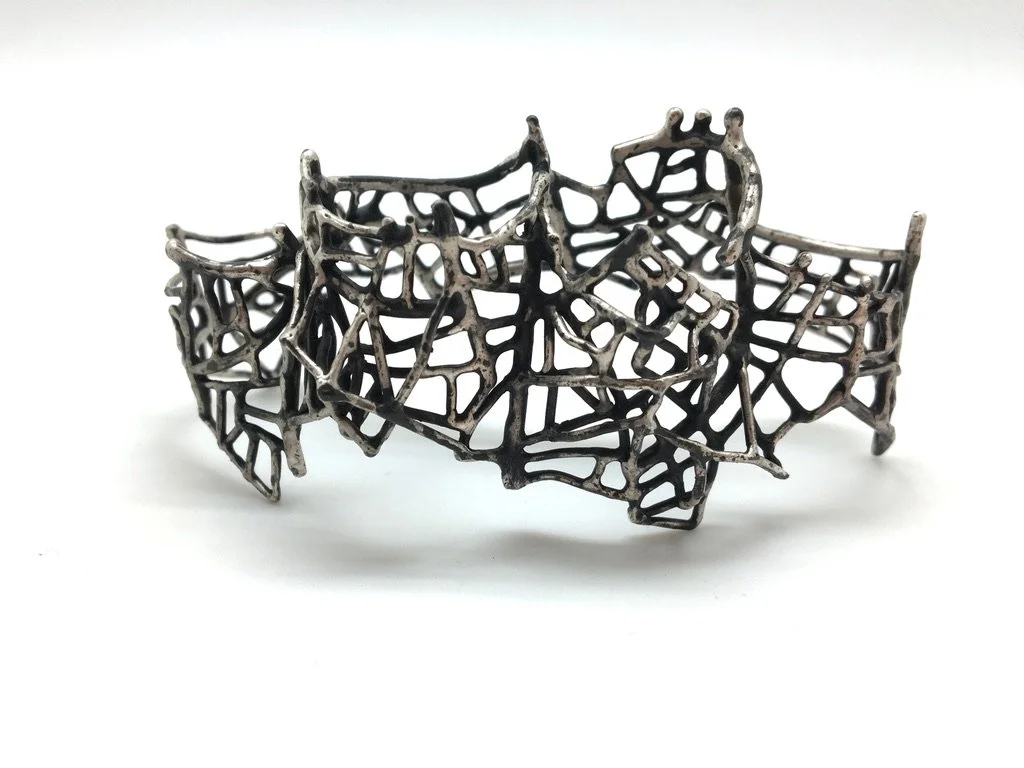 An interlacing that flows across the hand like a vineyard slope: boundaries meeting above, roots intertwining below. A geography of nourishment and pleasure, where life binds itself in invisible threads. The glove-ring embraces the hand, tracing a secret map of paths leading to fertility and abundance. Silver, returned to the earth, is clad in balsamic oxidation: a precious memory of the grape transformed into wine.
