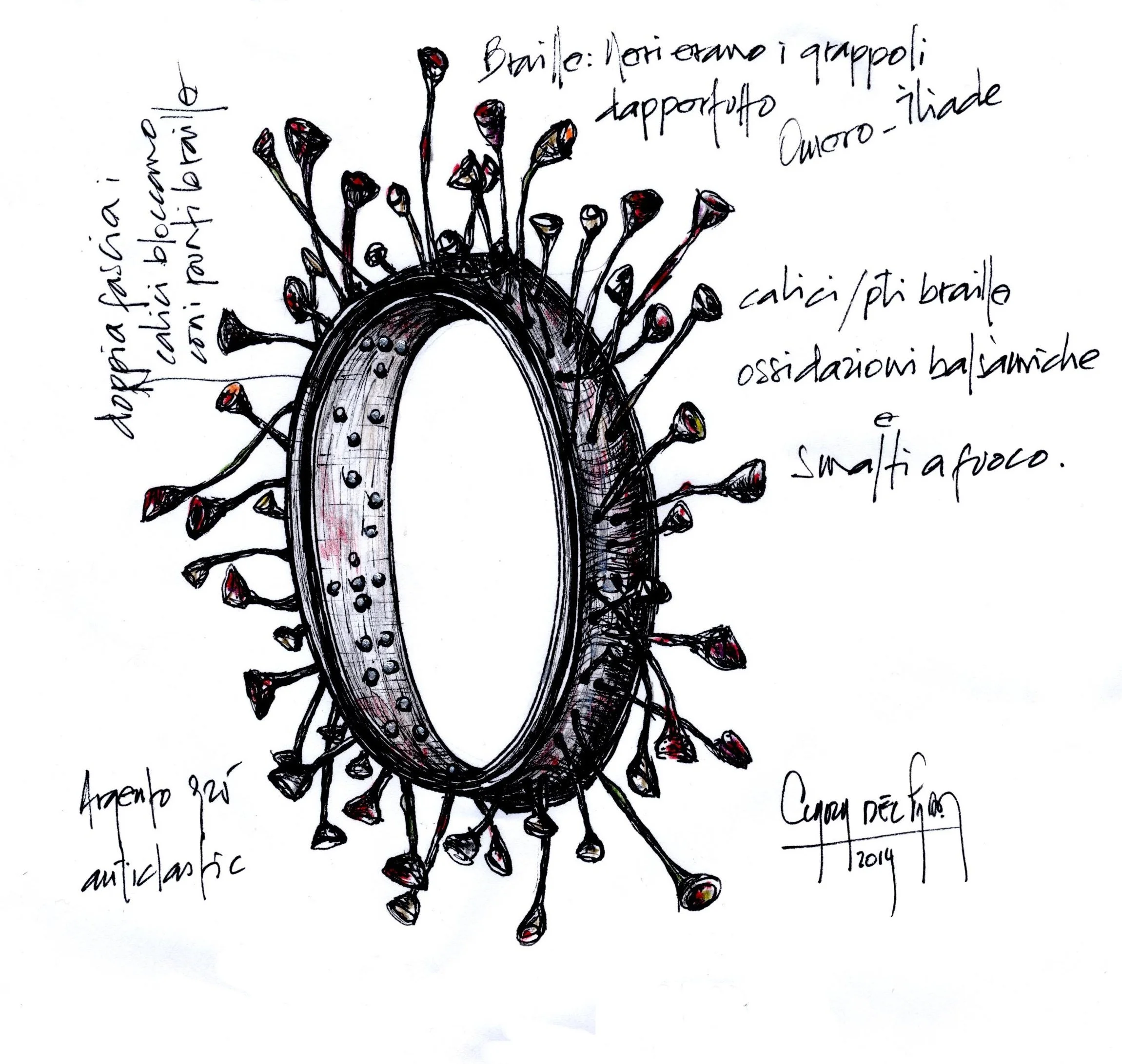 This is the inspiration for the jewel, hidden within the Braille points, visible only to those who do not look with their eyes. Red, earthy soil, opened as by a plough, and silver flowing roughly through hypogeal veins, yet becoming precious on the surface, in the cups offering the vine’s fruit: sanguine, strong, full-bodied, to be savored, expressing itself with impetuosity, as its Greek name suggests: Oρμή.
